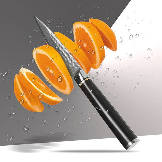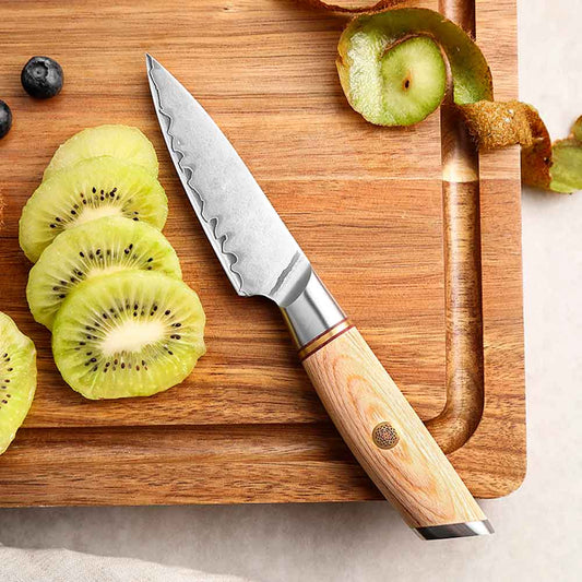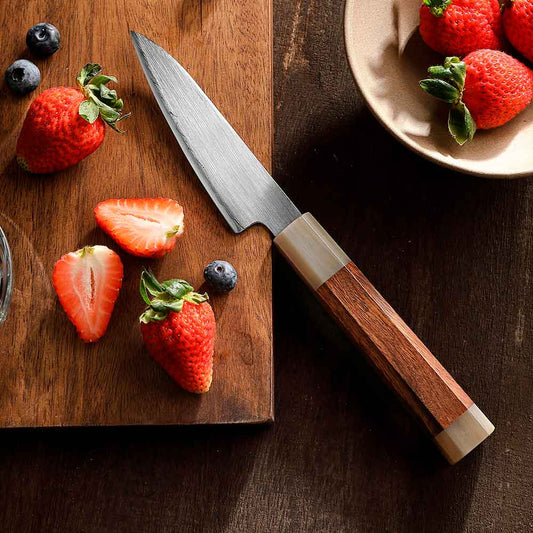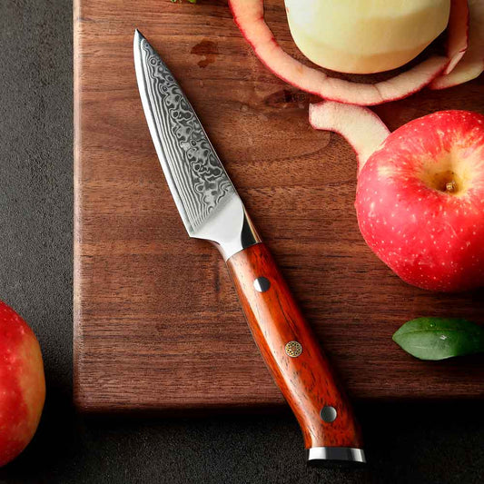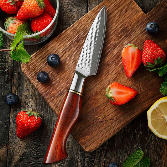 Cuchillo Petty 9cm 14Cr+Damasco Martillado PaloRosa
