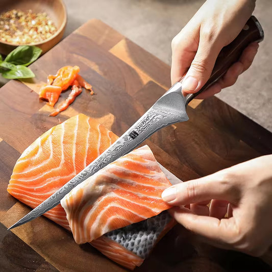 Cuchillo Fileteador de Pescado 18cm 10Cr+Damasco GOTAS de LLUVIA PaloRosa