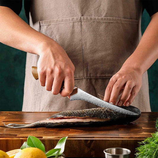 Cuchillo Fileteador 19cm 10Cr+Damasco Flamas Linen Micarta