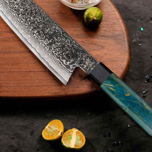 Cuchillo Kiritsuke 21cm Damasco lluvia+10Cr Mango madera Turquesa