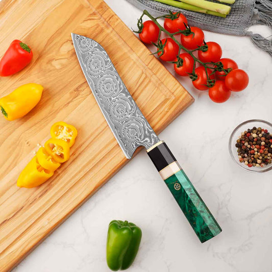 Cuchillo Santoku 18cm 10Cr+Damasco Rosas Ébano+Esmeralda