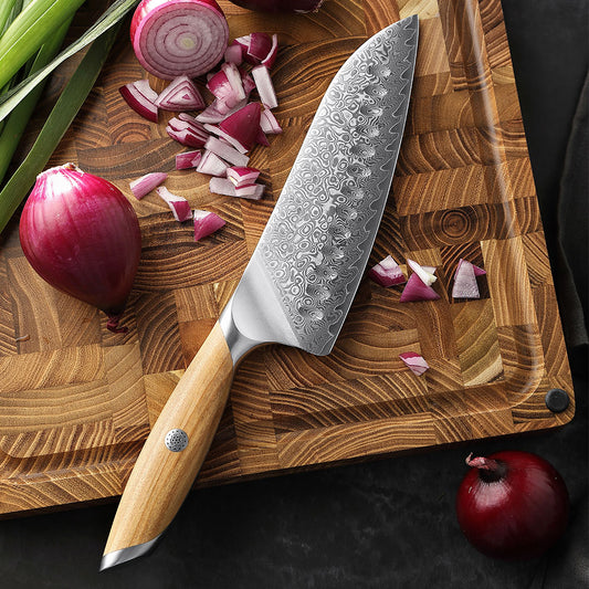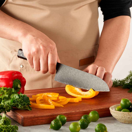 El Santoku, derivado de la cocina oriental, simboliza las tres virtudes: carne, pescado y verduras. Aunque en el mundo occidental, se ha adoptado principalmente como un cuchillo versátil para trabajar con verduras. En Perú, su popularidad entre las amas de casa está en aumento, gracias a su eficacia probada en la cocina diaria.