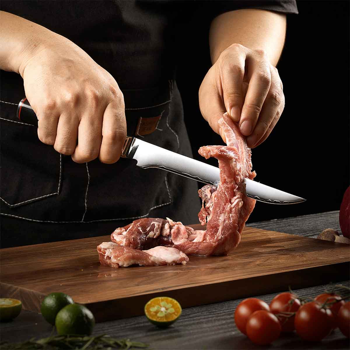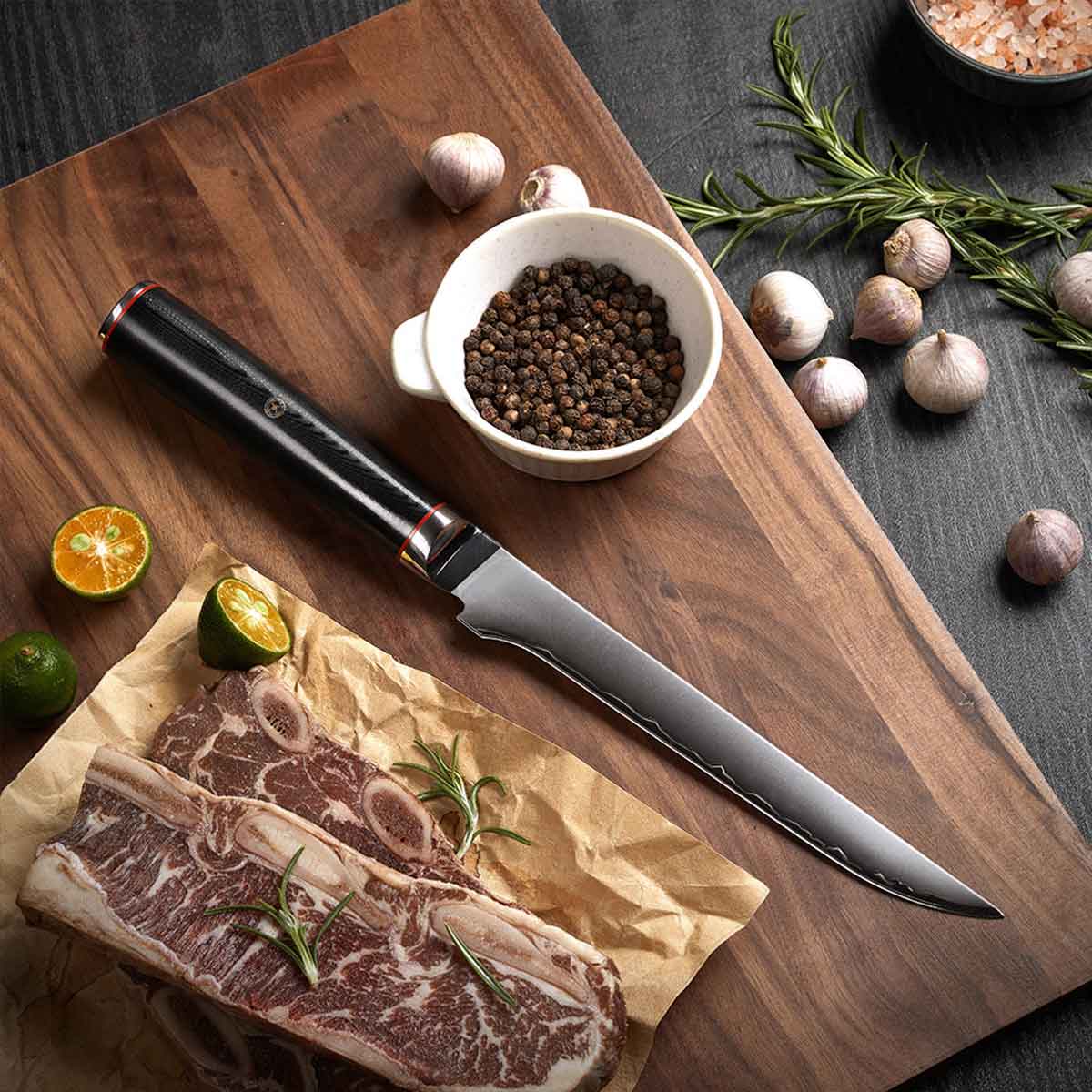 Cuchillo Deshuesador 18cm clad 10Cr Mango G10+rojo D-forma