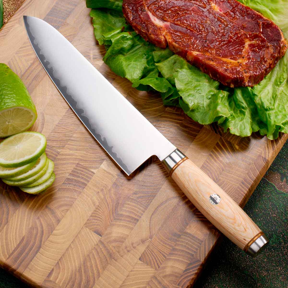La hoja del cuchillo viene con un súper filo y es afilada a un ángulo de aprox. 15° por cada lado de la hoja.