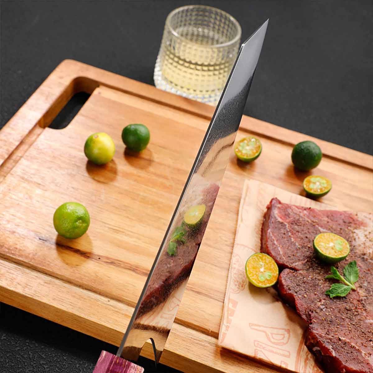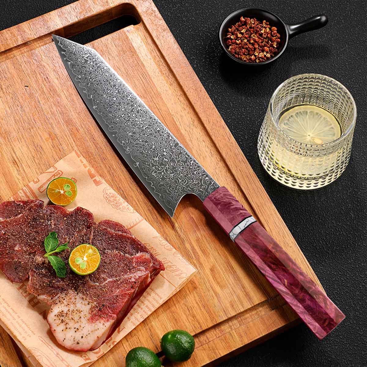 Cuchillo Kiritsuke 21cm Damasco lluvia+10Cr Madera Morada