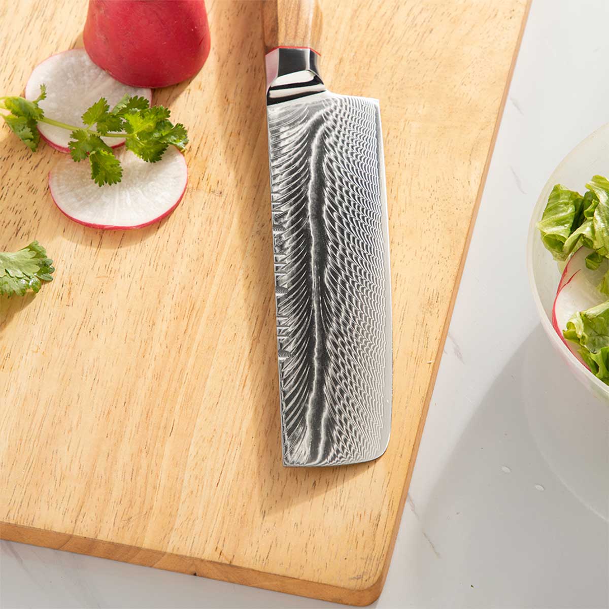 - El exterior con un diseño especial martillado y de 66 capas de DAMASCO San Mai de un acero SUS430 inoxidable blando.