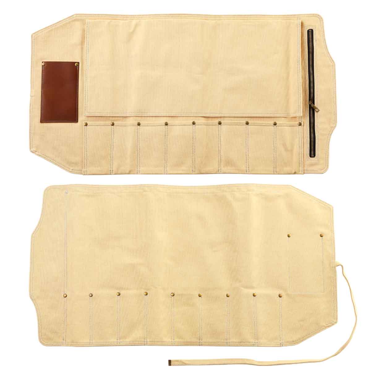 Roll de lona gruesa con detalles en cuero de alta calidad. Diseño simple que muestra un estilo magnífico y te brinda una experiencia completamente nueva. Cuenta con 8 espacios para cuchillos, 1 cierre para utensilios adicionales y 1 bolsillo para tijeras.