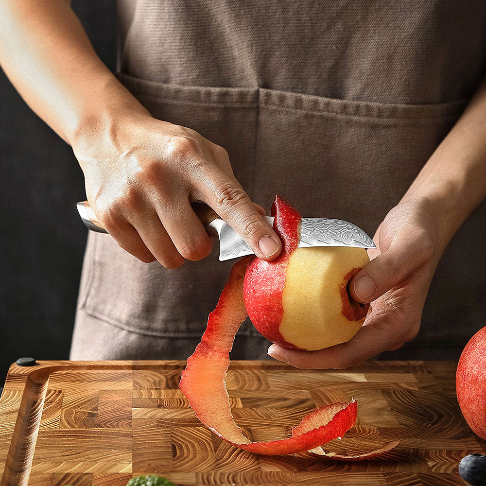 La hoja del cuchillo viene con un súper filo y es afilada a un ángulo de aprox. 15°por cada lado de la hoja.