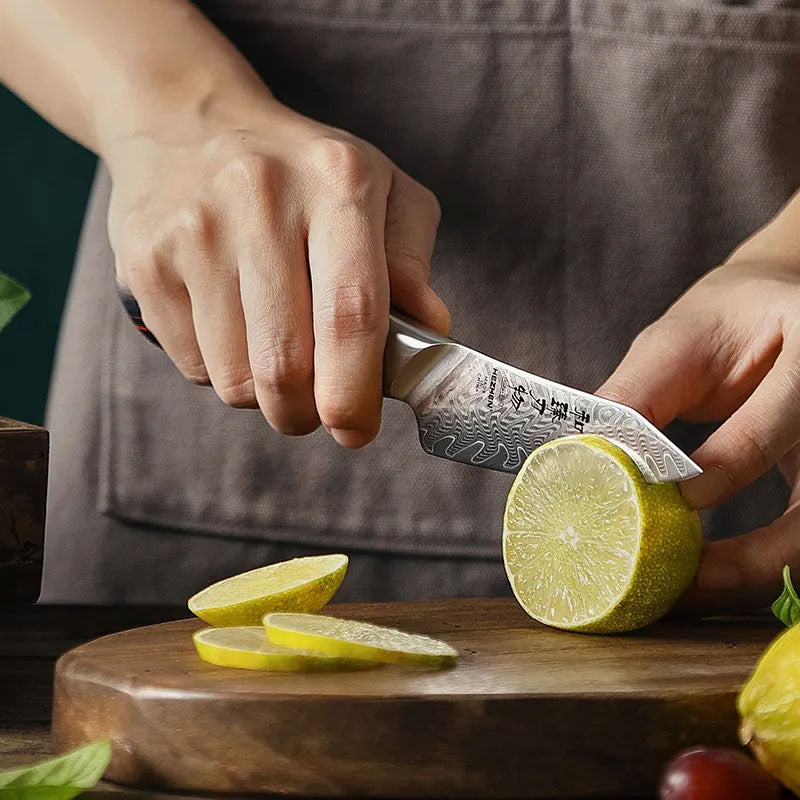 Cuchillo Petty 9cm acero muy alto carbono inoxidable y damasco san mai.