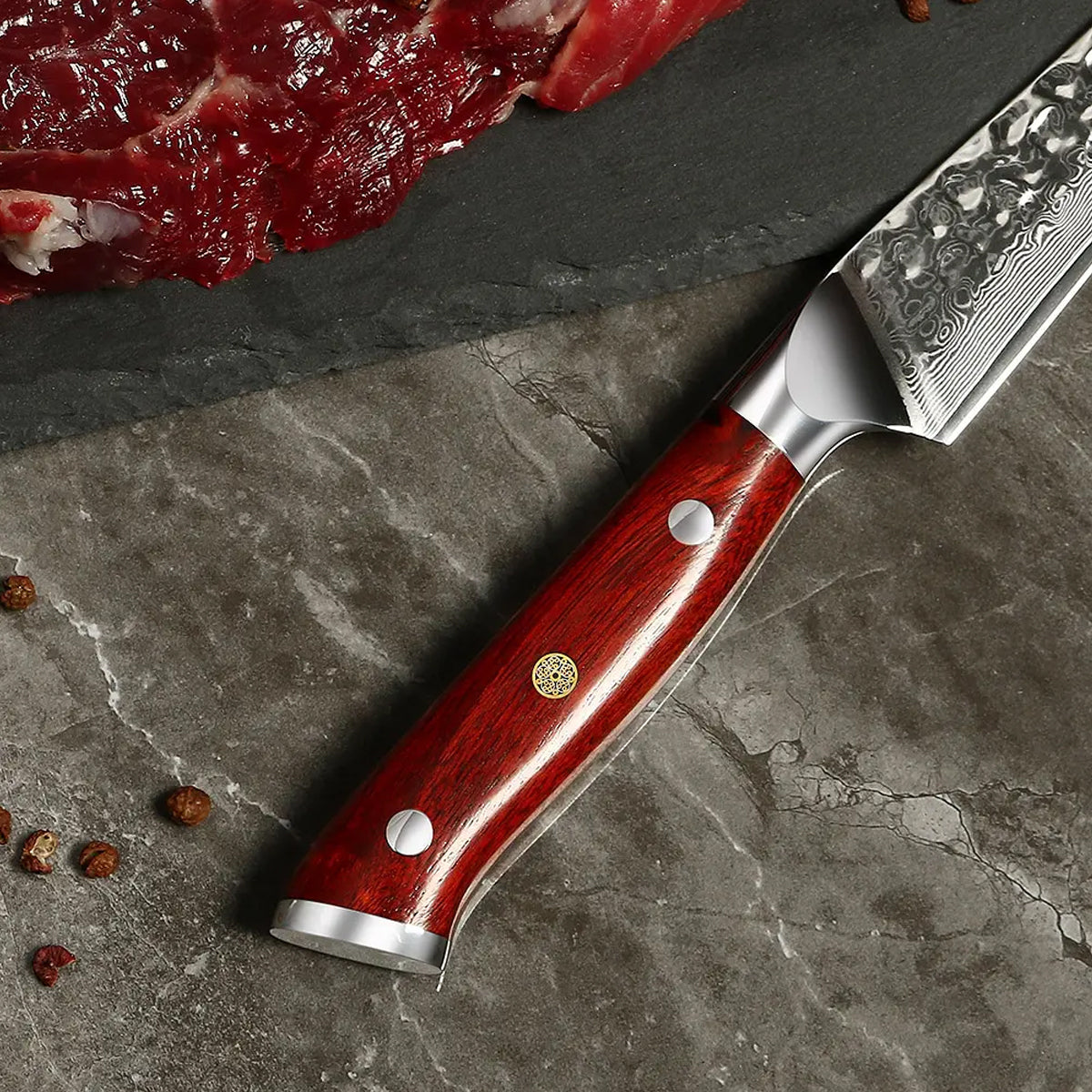 El mango del cuchillo, hecho de madera maciza de Palo de Rosa pulida, ofrece un agarre suave y cómodo. Su diseño clásico ergonómico se adapta a la mano.