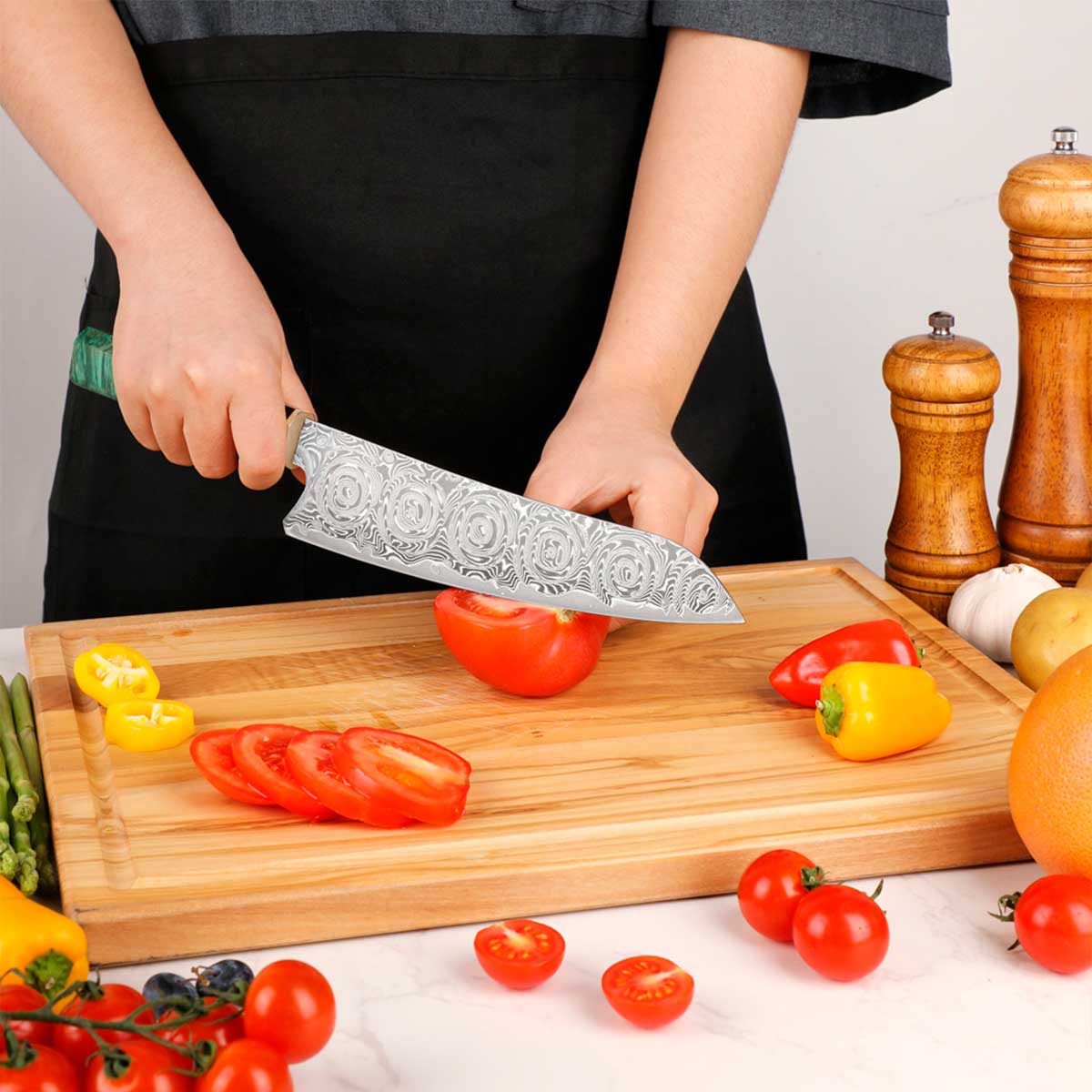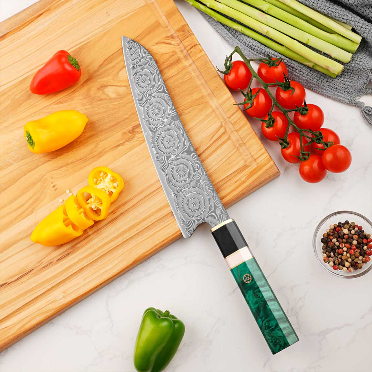 Cuchillo Gyuto 22cm 10Cr+Damasco Rosas Ébano+Esmeralda