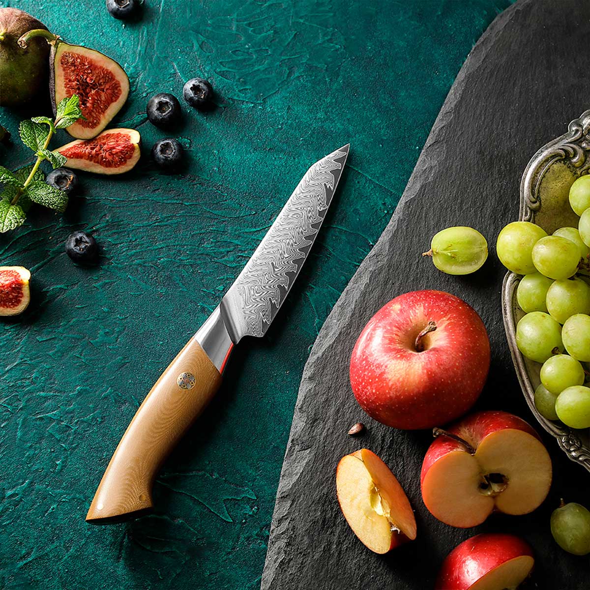 Cuchillo Petty 11cm 10Cr+Damasco Flamas Linen Micarta