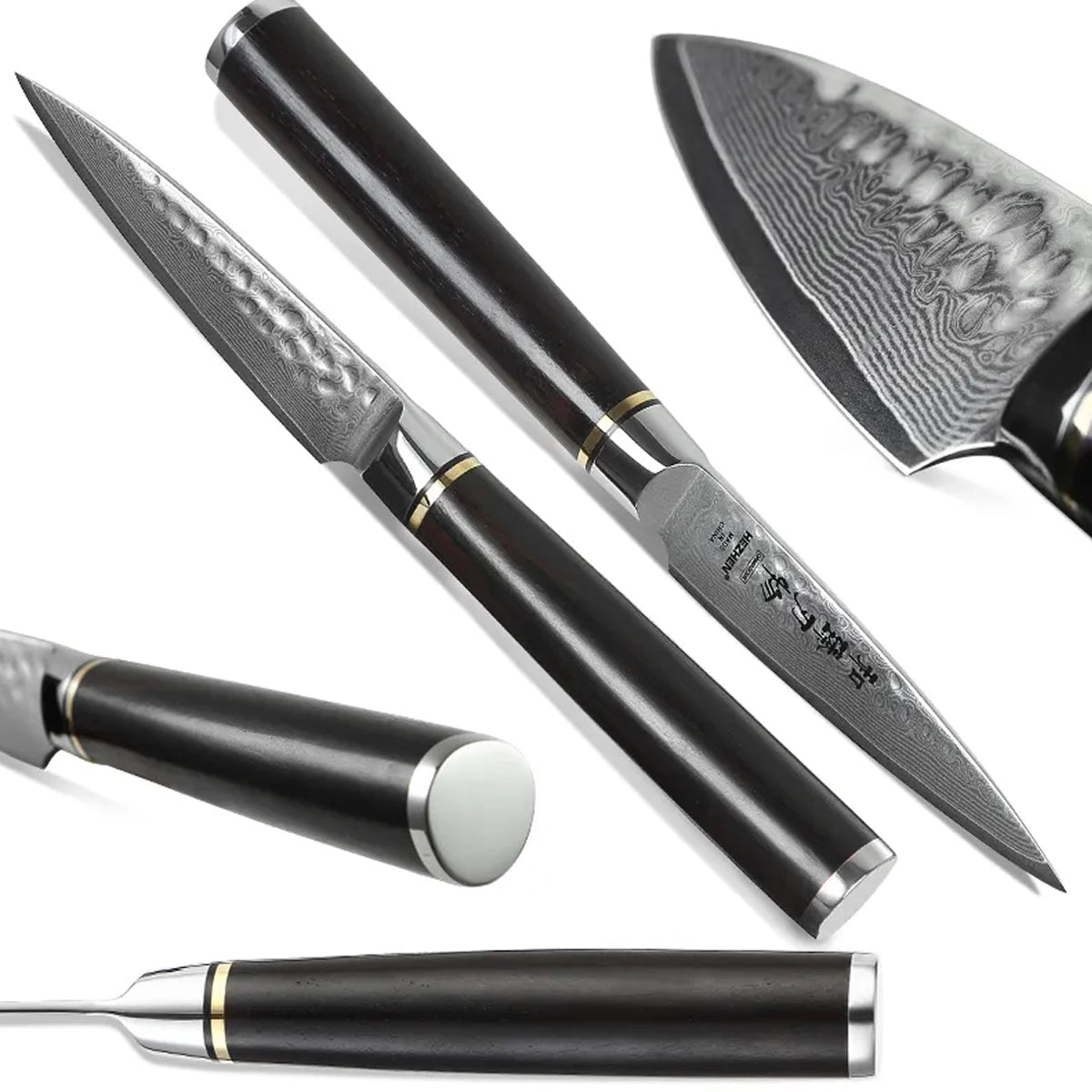 Cuchillo Petty 9cm 10Cr+Damasco Martillado Ebano+Bronce