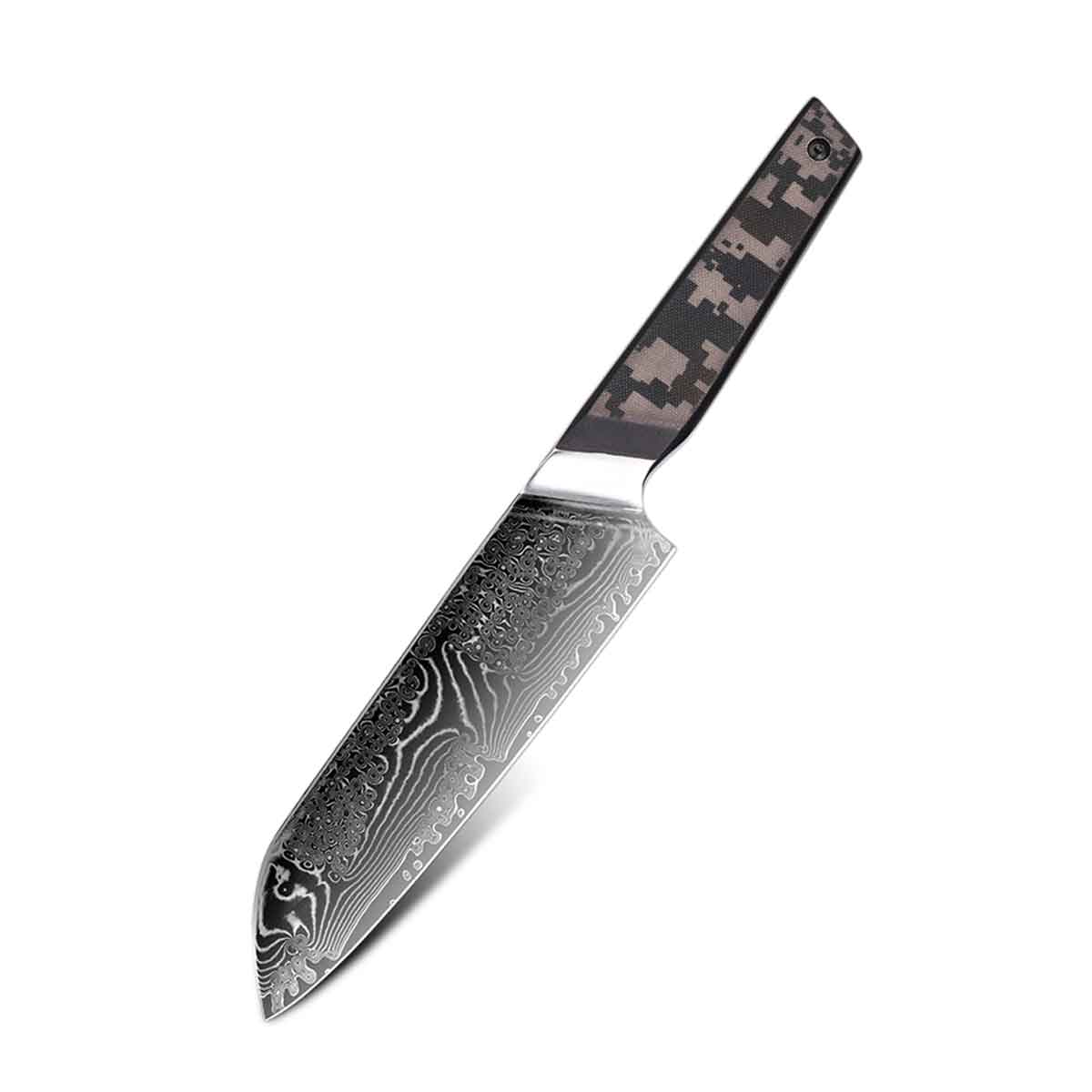 Este Santoku de 18 cm destaca no solo por su versatilidad en la cocina, sino también por su diseño audaz. La hoja de acero 10Cr con un patrón de Damasco asegura cortes suaves y precisos, ideal para carnes, pescados y vegetales. El mango de G10, con un estilo camuflado, ofrece un agarre firme y resistente, aportando modernidad y durabilidad. Con 223 g de peso, equilibra perfectamente potencia y control en cada movimiento.