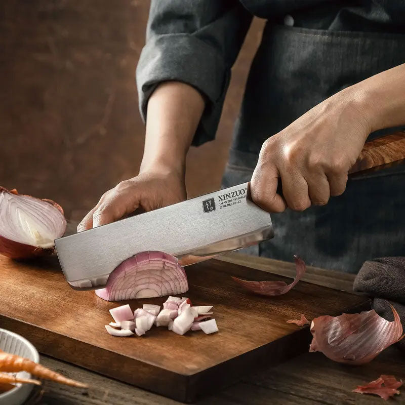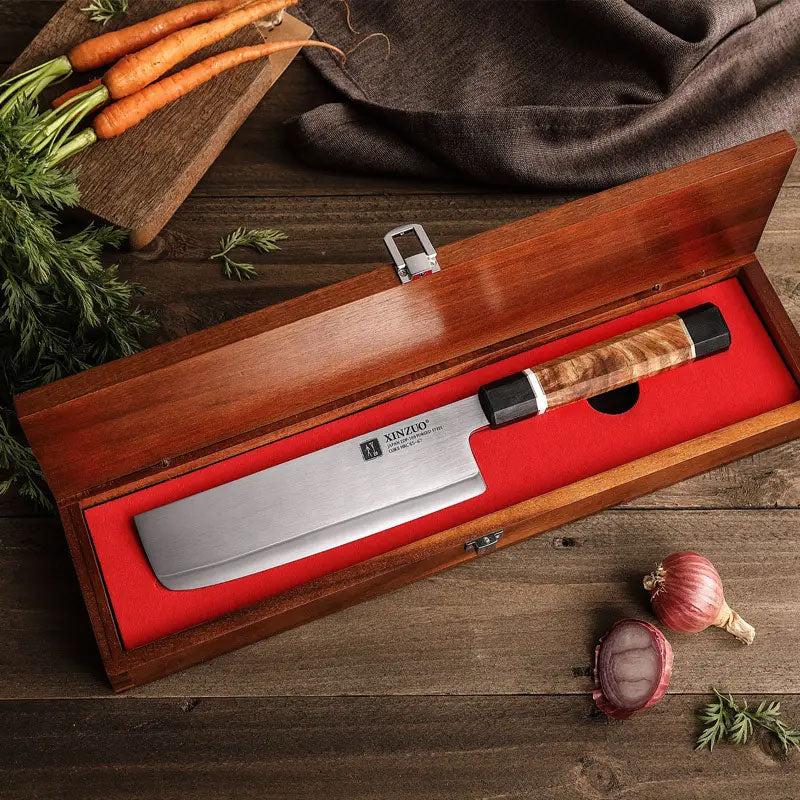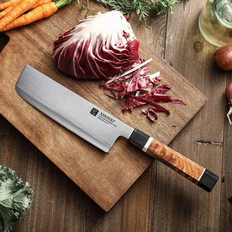 Cuando se trata de cortar verduras muy finas al final dependerá del acero. Con mejor acero podemos afilar a un ángulo más bajo. Este nakiri hecho con la exclusiva hoja del mejor acero japonés proporcionando una retención extremadamente superior del filo. El mango octagonal un agarre cómodo y seguro para una experiencia de corte excepcional.