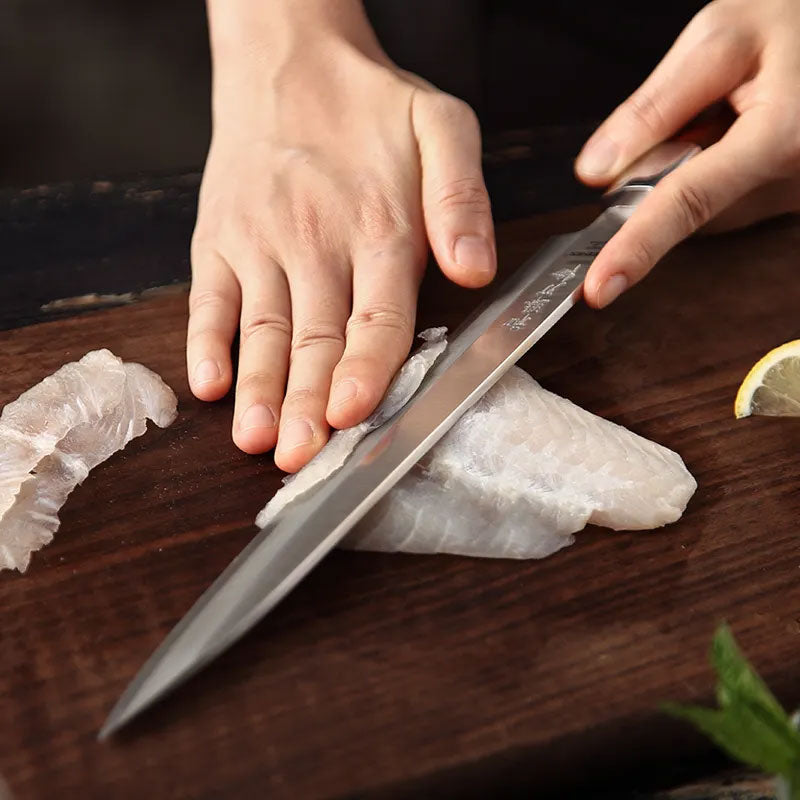 Cuchillo usado en cocina Nikkei cortar tiras de filete de pescado. Se usa en platos orientales de Sushi, Sashimi y Nigiri.